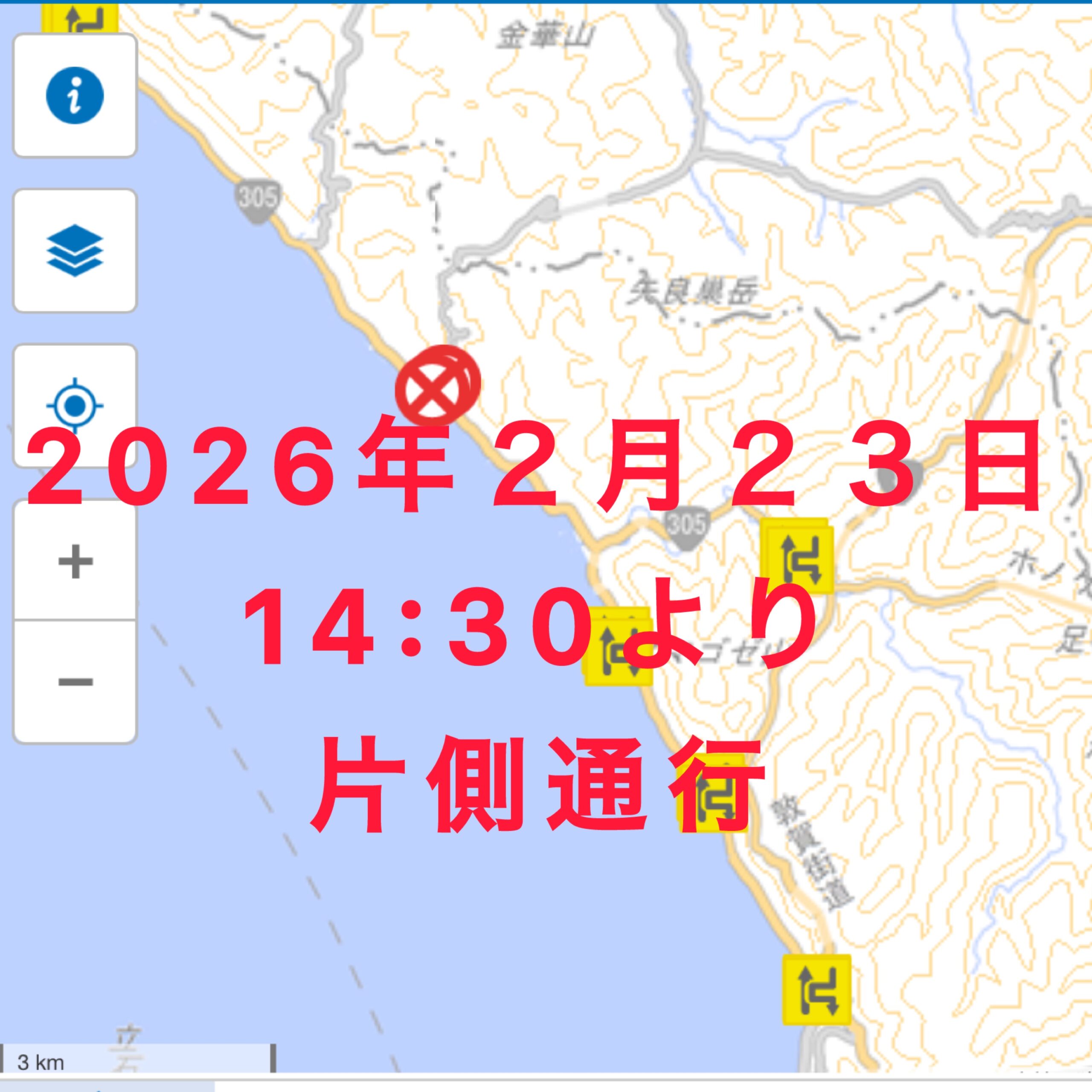 2026年2月22日に落石で越前海岸の越前町米ノ~南越前糠間が通行止めとなっていましたが、2026年2月23日14:30より片側通行となりましたのでお知らせいたします。 みち情報ネットふくい