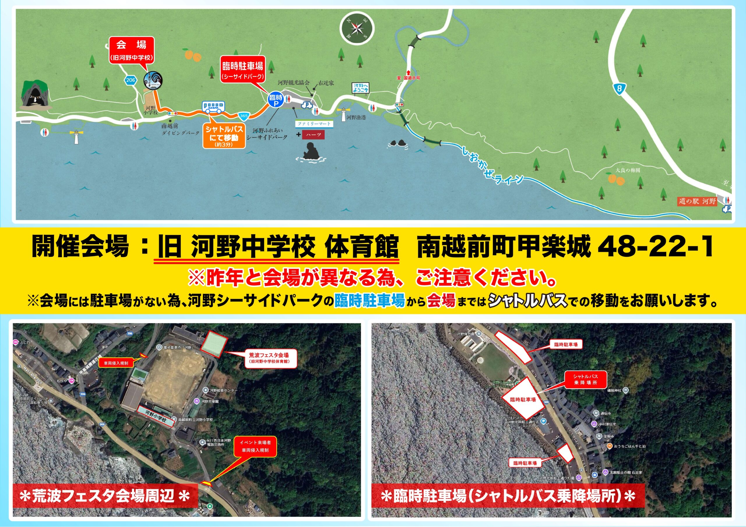 今回は、会場を旧河野中学校体育館に変更しての開催となりますので、ご注意下さいますようお願い申し上げます。 会場には駐車場がないため、臨時駐車場の河野シーサイドパークから会場までは、シャトルバスでのご移動となりますので、ご不便をおかけしますが、よろしくお願いします。